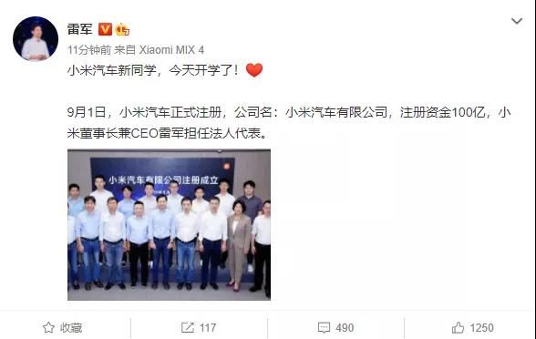 9月1日消息,雷军在微博宣布:“小米汽车新同学,今天开学了!”雷军表示,9月1日,小米汽车正式注册,公司名:小米汽车有限公司,注册资金100亿,小米董事长兼CEO雷军担任法人代表。
