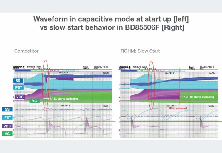 图6:启动时处于电容模式的波形[左]以及BD85506F的慢启动行为[右](图片来源:ROHM)