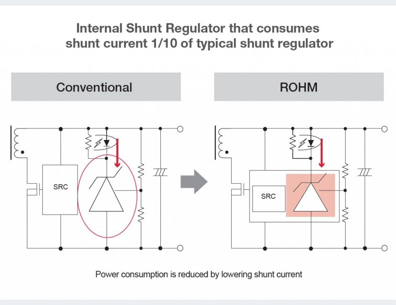 图7:与传统并联稳压器相比,ROHM的内部并联稳压器的并联电流仅为十分之一(图片来源:ROHM)