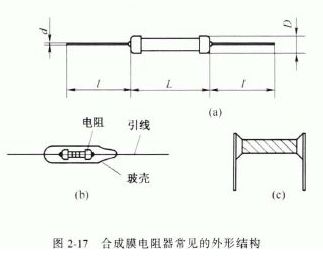 合成膜电阻器以碳黑作为导电材料,以有机树脂为黏合剂混合制成导电悬浮液,均匀涂覆在陶坚绝缘基体上,经加热聚合而制成高压和高阻值电阻器。有的电阻器还用玻璃壳封装制成真空兆欧电阻器。合成膜电阻器主要用于微电流测试、视IJ 湿仪表、高阻电阻箱、负离子发生器等仪器仪表中。合成膜电阻器常见的外形结构如图2-17 所示。 合成膜电阻器具有以下特点:①阻值范围高,最高可达1 X 10 6MΩ。②生产工艺简单,价格便宜。③缺点是抗湿性差,电压稳定性差、频率特性不好,噪声大。