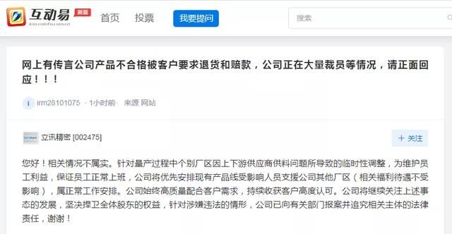 近日网上有传言称,立讯精密产品不合格被客户要求退货和赔款,公司正在大量裁员等,立讯精密今天在深交所互动易上回答该提问时表示:相关情况不属实。