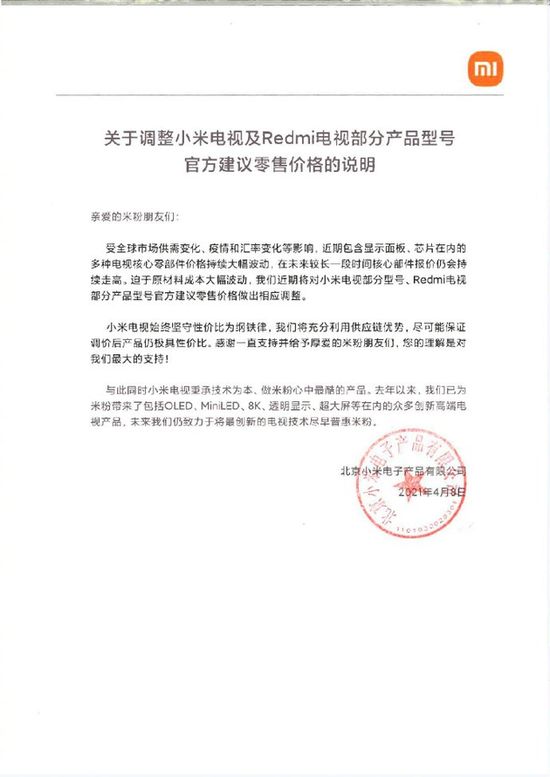 4月8日下午消息,小米电视官方微博今日宣布调价,发布了关于调整小米电视及Redmi电视部分产品型号官方建议零售价格的说明。