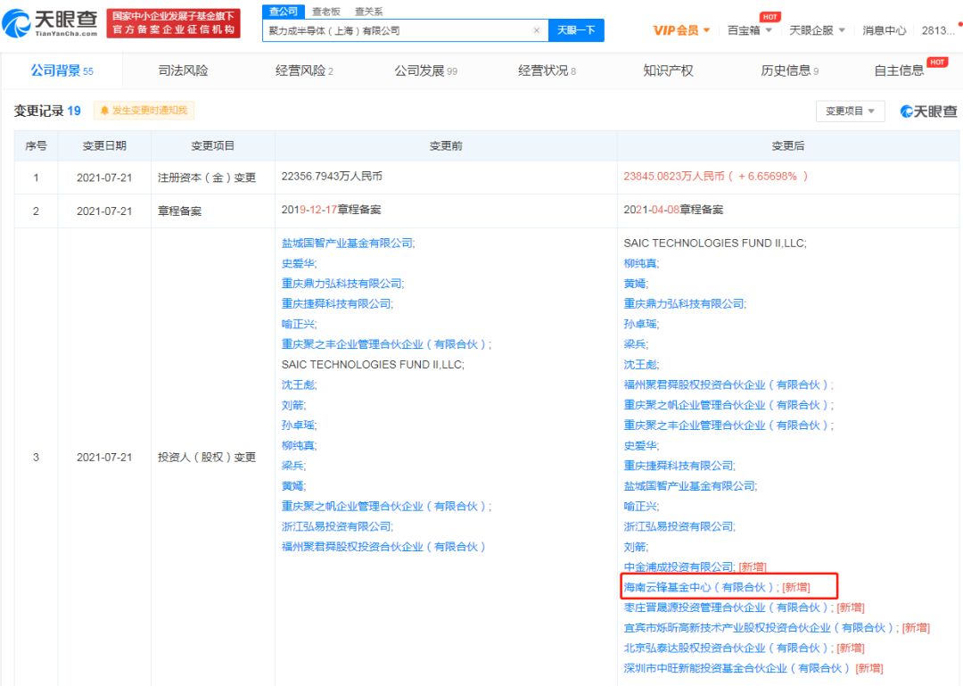 天眼查信息显示,近日,聚力成半导体(上海)有限公司发生工商变更,新增海南云锋基金中心(有限合伙)、中金浦成投资有限公司等为股东。