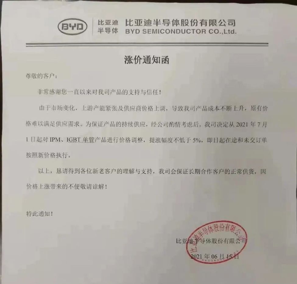 近日,比亚迪半导体向客户发出涨价通知函,公司决定从2021年7月1日起对IPM、IGBT单管产品进行价格调整,提涨幅度不低于5%。