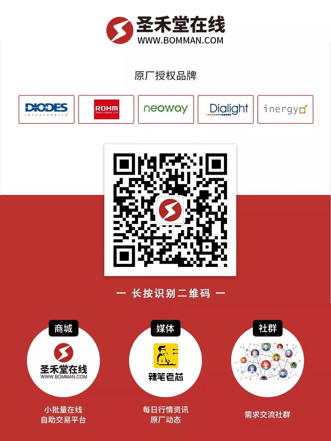 圣禾堂在线(www.bomman.com)——是圣禾堂旗下的一站式电子元器件交易平台,拥有1.5亿人民币现货库存,1万平米智能恒温仓库,超过10万条库存数据,先后获得DIODES、ROHM、有方模块等多个一线品牌原厂授权,合作产品线超过100条。