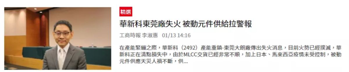 2021年1月13日,半导体行业又迎来噩耗——华新科(2492)产能重镇东莞大朗厂失火,目前火势已经扑灭,华新科正在清点损失之中。