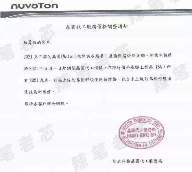 通知内容:2021年第三季晶圆依然供不应求,产能供需仍然失调。新唐科技将于2021年9月1日起调整晶圆代工价,在现行价格基础上提高15%,所有2021年9月1日起上线的晶圆都须使用新价格,包含未上线订单部分皆须修改为新单价。