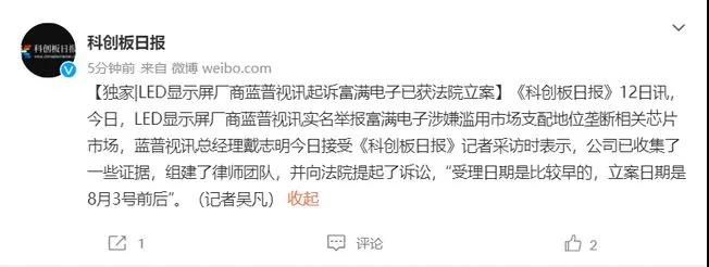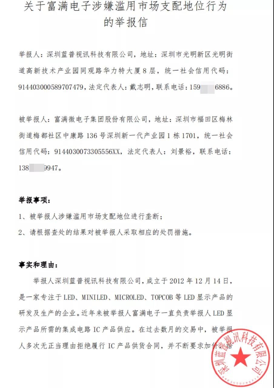 蓝普视讯还称,已经向中国光学光电子行业协会和国家市场监督管理总局反垄断局提交了《关于富满电子涉嫌滥用市场支配地位垄断相关芯片市场的举报信》,截至目前,已收到了行业近100家受害企业的声援,9家显示屏幕企业请求参与联合诉讼。