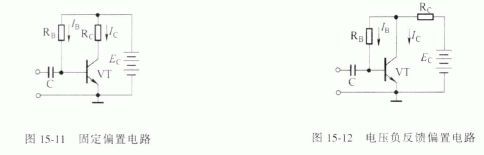 固定偏置电路如图15-11 所示,它是共发射极放大电路。当EC和RB一经确定,就能得到一个固定的基极电流lB和集电极电流IC, 所以把这种电路叫做固定偏置电路。