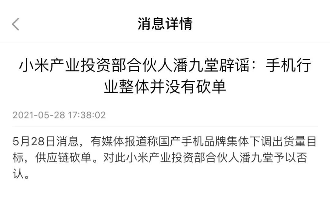 但28日最新报道,小米产业投资部合伙人潘九堂辟谣:手机行业并没有砍单。