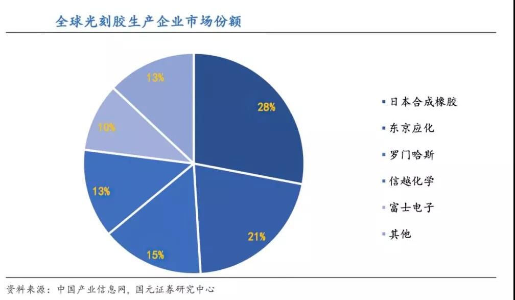 目前全球光刻胶市场份额集中在日本JSR、日本东京应化、美国罗门哈斯、日本信越化学和日本富士电子,占比高达 97%,日本龙头地位明显,合计占比 72%。