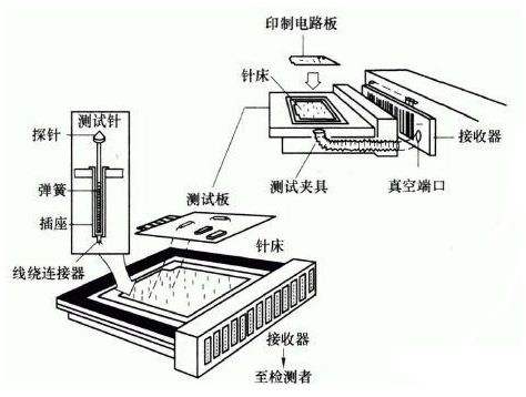 这种方法由带有弹簧的探针连接到电路板上的每一个检测点。弹簧使每个探针具有100 - 200g 的压力,以保证每个检测点接触良好,这样的探针排列在一起被称为"针床"。在检测软件的控制下,可以对检测点和检测信号进行编程,图是一种典型的针床测试仪结构,检测者可以获知所有测试点的信息。实际上只有那些需要测试的测试点的探针是安装了的。尽管使用针床测试法可能同时在电路板的两面进行检测,当设计电路板时,还是应该使所有的检测点在电路板的焊接面。针床测试仪设备昂贵,且很难维修。针头依据其具体应用选不同排列的探针。