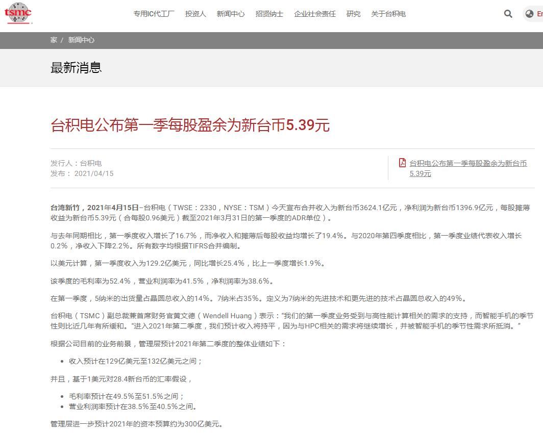 台积电官网4月15日,公布截至2021年3月31日的第一季度财报。