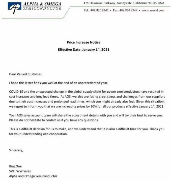12月29日,功率IC大厂AOS(万代半导体)发出涨价通知函。通知函中表示:“自2021年1月1日起,所有产品的价格将提高20%”。