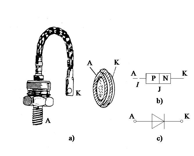 电力二极管引出两个极,分别称为阳极A和阴极K,使用的符号也与中、小功率电力二极管一样,如图1所示。由于电力二极管的功耗较大,它的外形有螺旋式和平板式两种。螺旋式二极管的阳极紧拴在散热器上。平板式二极管又分为风冷式和水冷式,它的阳极和阴极分别由两个彼此绝缘的散热器紧紧夹住。