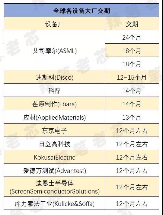 全球曝光设备大厂艾司摩尔(ASML)的ArF设备,交付周期达到了24个月,iline扫描仪交期则为18个月,极紫外线曝光设备(EUV)的交期则是18个月。
