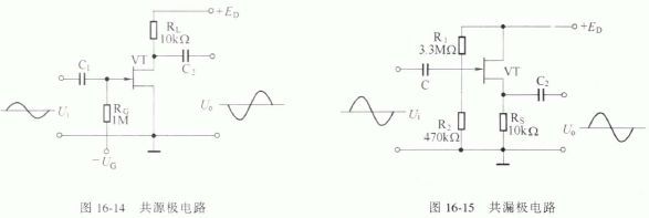 共源极电路除有图16-13 所示的接法外,还可采用图16-14 所示的电路。这种电路的栅偏压是由负电压UG经偏置电阻RG提供的。该电路虽然简单.但R G不易取得过大.否则会在栅漏泄电流流过时产生较大的压降,使栅偏压发生变化.造成工作点的偏离。共源极基本放大电路的主要参数,可由以下各式确定: