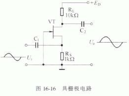 共栅极电路如图16-16 所示。偏置电路为自给偏置,当ID流经Rs时产生压降ID· Rs, 由于栅极接地,相当于源极电位比栅极高出一个ID· Rs值。这种方法简单.栅极电压也会随信号自动调节,对工作点的稳定有好处C 该电路有良好的放大特性。