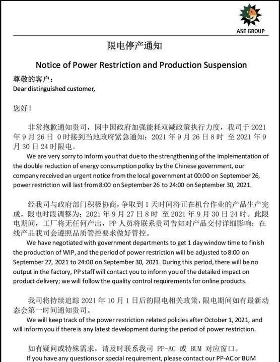 封测厂最先坐实限电停产。9月26日,日月光半导体(昆山)有限公司(以下简称“日月光半导体”)对客户发布公告称,因中国政府加强能耗双减政策执行力度,其接到当地政府紧急限电通知,经协商,其将于2021年9月27日8时至2021年9月30日24时限电。限电期间,工厂将无任何产出。