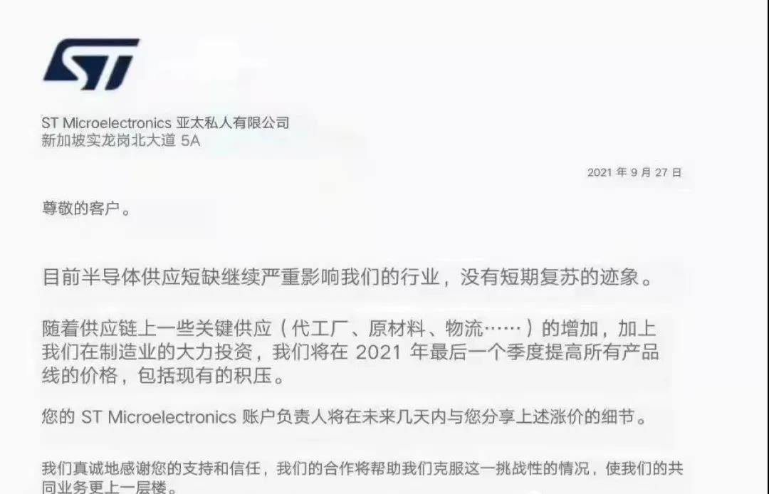 9月27日,ST发布涨价通知。通知函称,目前半导体供应短缺继续严重影响我们的行业,短期内没有复苏的迹象。