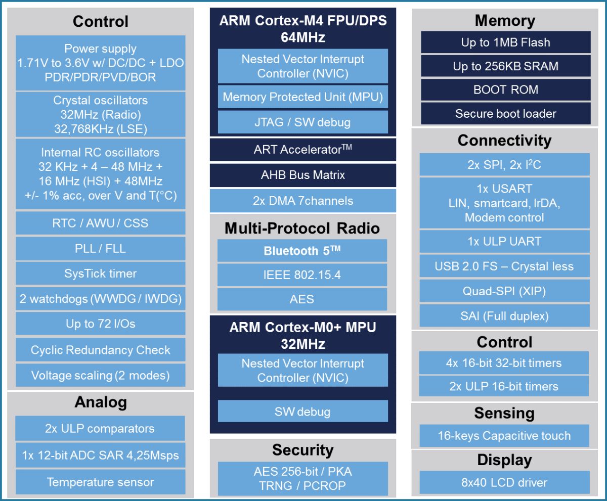 STM32WB55系列MCU主频为64MHz, 射频内核主频为32MHz,内部FLASH最大可以支持1MB, 内部RAM最大支持256kB。芯片封装方面提供了QFN48, QFN68, WLCSP100, BGA129,方便客户在不同应用中选择不同封装。
