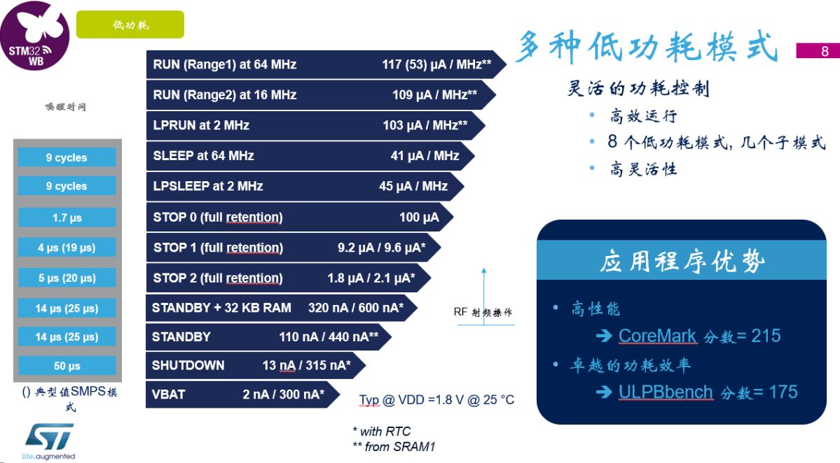 功耗更低。受限于外形和重量的原因,目前的智能手表无法配置更大容量的电池,续航能力不足,需要频繁充电。很多高端的智能手表每天至少需要充电一次才能保证设备的正常运行,这极大的影响了用户体验。STM32WB55系列产品STOP2模式下,RAM数据全部保存,RTC正常计时,系统最低功耗只有2.1uA,全速运行时,在使用SMPS给核电压供电的条件下,系统功耗仅为53uA/MHz。STM32WB55系列包含很多种通信功能,包括实用的无晶振USB 2.0 FS接口、音频支持、LCD驱动、触摸感应、多达72个GPIO、用于优化功耗的集成SMPS和多种低功耗模式以最大限度地延长电池寿命。