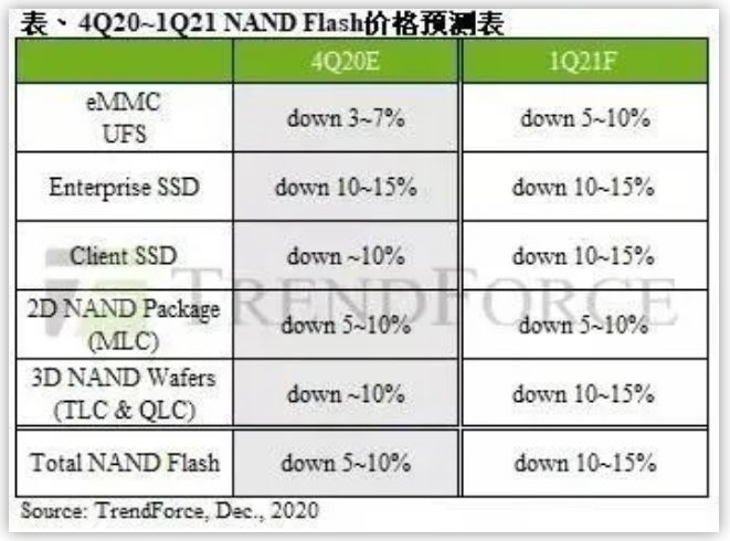 据台媒工商时报报道,集邦科技旗下半导体研究处指出,由于NAND Flash供应商数量远高于DRAM,加上供给位元成长的幅度居高不下,预计2021年价格仍将逐季下跌。