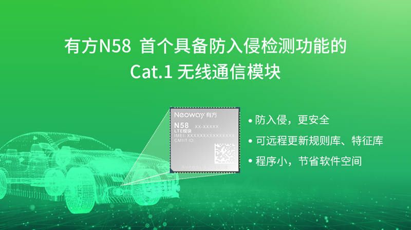 为提升网联汽车通信安全,防范恶意攻击,避免信息泄露,有方科技N58全面提升软件安全防护能力和等级,并于近日正式通过中国汽车技术研究中心(以下简称中汽研)的汽车安全测试,成为第一款具备防入侵监测功能的Cat.1无线通信模块。