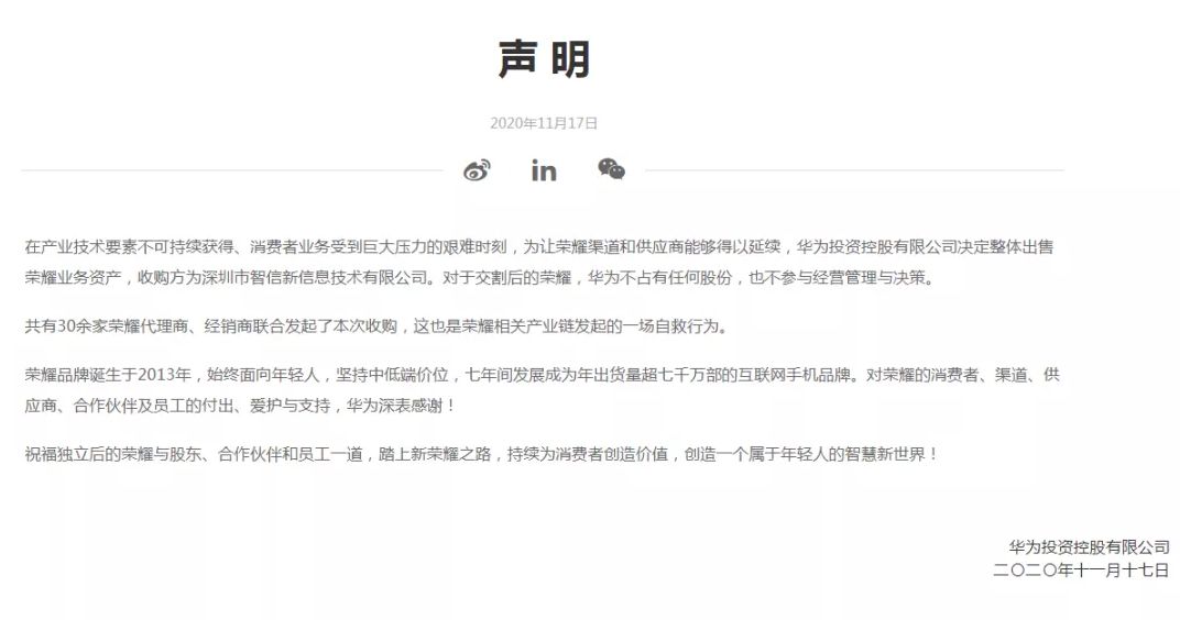 随即华为回应了出售荣耀:一场自救行为,不占股经营,只为荣耀延续!双方的官宣也终结了业界的各种传闻。华为发表声明还表示,整体出售荣耀业务资产。对于交割后的荣耀,华为不占有任何股份,也不参与经营管理与决策。声明如下: