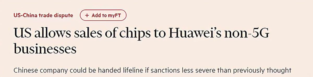 2018年华为正式发布的Balong 5G01是全球首款基于3GPP(移动通信的标准化机构)标准的5G商用芯片。可能是老美觊觎华为5G科技的优秀,一直打击华为,自限芯令实施以来,导致一大批芯片半导体公司失去中国这么大市场,业绩受到影响! 于是为了吊住我们这块大肥肉,老美最近开始松口了~