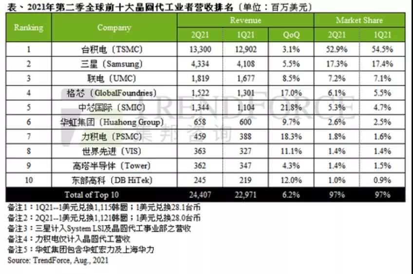 排名第三的联电受惠 PMIC、TDDI、Wi-Fi、OLED 驱动 IC 等需求,产能严重供不应求,持续对客户涨价,加上价格较高的 28/22nm 新增产能陆续开出,带动第二季平均售价上涨约 5%,营收达 18.2 亿美元,季增 8.5%,市占大致持平在 7.2%。