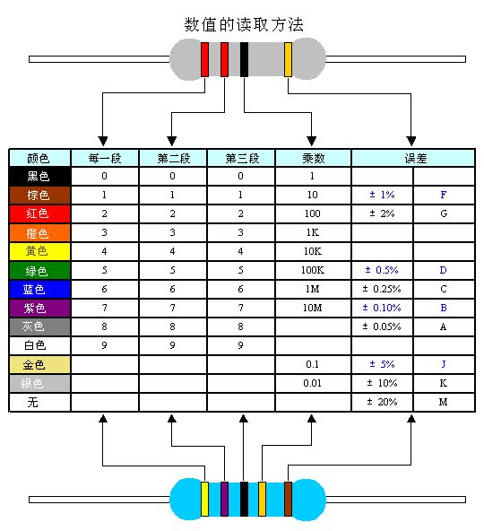 黑-0、棕-1、红-2、橙-3、黄-4、绿-5、蓝-6、紫-7、灰-8、白-9、金-±5%、银-±10%、无色-±20%