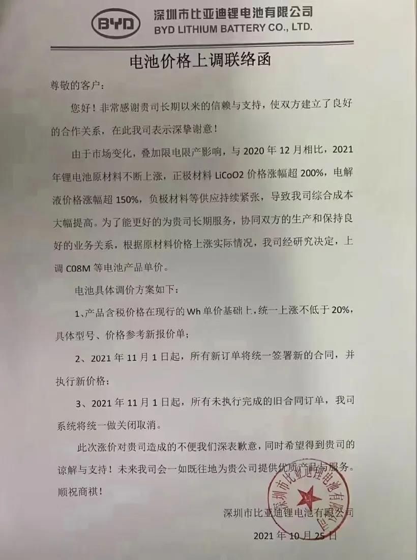 今日有一份比亚迪的电池价格上调联络函在市场上传开,与此同时,和泰涨价的消息也被曝光。