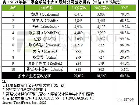 研调机构集邦咨询(TrendForce)昨(15)日公布最新报告指出,今年第2季全球前十大IC设计厂营收合计达298亿美元,年增60.8%。