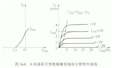 N 沟道耗尽型绝缘栅型场效应管的特性曲线如图16-8 所示,它基本上与N 沟道结型场效应管的特性一致。
