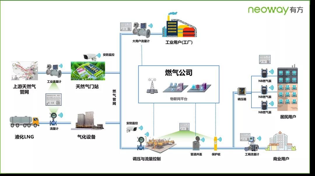 随着物联网技术的发展,NB-IoT被纳入5G协议标准,成为5G技术的先行者,通过NB-IoT技术能够满足各类燃气计量设备、压力/温度监测终端、气体泄露监测终端、燃气生产控制系统等的数据采集和传输,实现燃气公司管理的智能化和自动化,可以极大提升燃气的生产、输送、储存以及使用的效率和安全性。