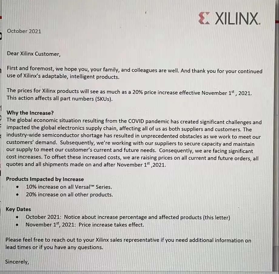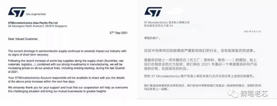 其中,ST意法半导体27日再次发布涨价函:随着供应链上的一些关键供应(代工厂、原材料、物流......)的增加,加上公司在制造业上的大力投资。ST将在2021年最后一个季度(第四季度)提高所有产品价格,包括现有的库存。