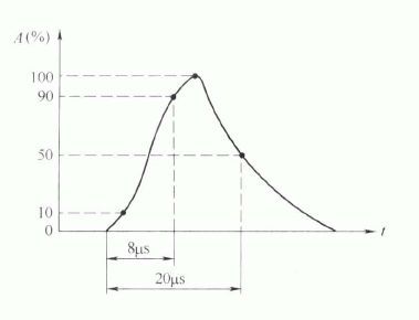 ③限制电压VC:对压敏电阻器施加规定的标准波形(8/20us)和规定的电流时(见图),压敏电阻两端的最大电压。