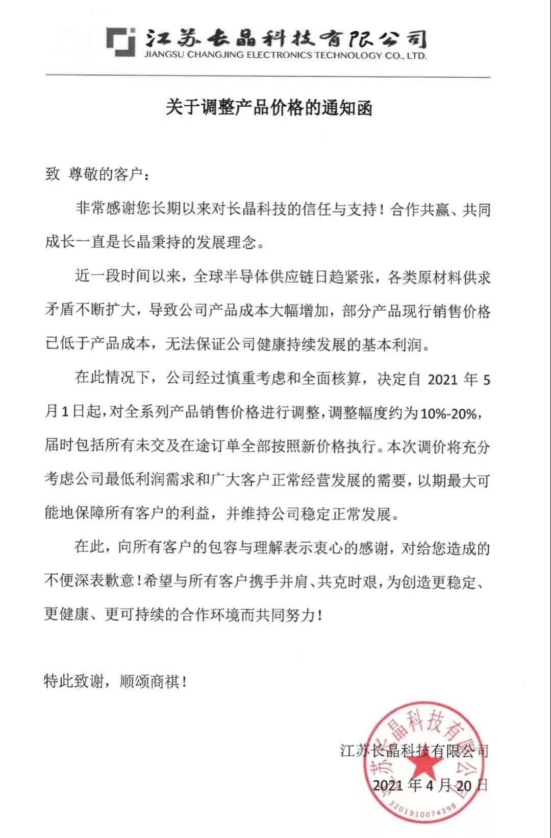 昨日(4月20日),一张疑似长晶科技的涨价函在朋友圈出现:长晶科技表示,因产品成本增加,决定自2021年5月1日起,对全系列产品销售价格进行调整,调整幅度为10%-20%。届时包括所有未交及在途订单全部按照新价格执行。