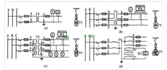 为了测取这些电压,电压互感器就有了不同的接线方式,最常见的有以下几种