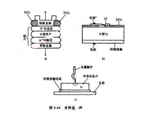 电子从半导体向金属扩散运动的结果,形成空间电荷区、自建电场和势垒,并且耗尽层只在N型半导体一边(势垒区全部落在半导体一侧)。势垒区中自建电场方向由N型区指向金属,随热电子发射自建场增加,与扩散电流方向相反的漂移电流增大,最终达到动态平衡,在金属与半导体之间形成一个接触势垒,这就是肖特基势垒。