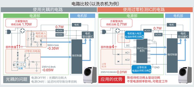 为了有效地对电机和微控制器进行控制,很多白色家电中都需要配置用来检测AC(交流)波形的0V电位(过零点※注)的电路(过零检测电路)。在以往的过零检测电路中,通常会使用光耦,其功耗约占整个应用的待机功耗的1/2。