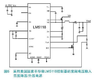 图6是一个以LM5118仿电流模式降压/升压控制器来实现的降压/升压拓扑实例。