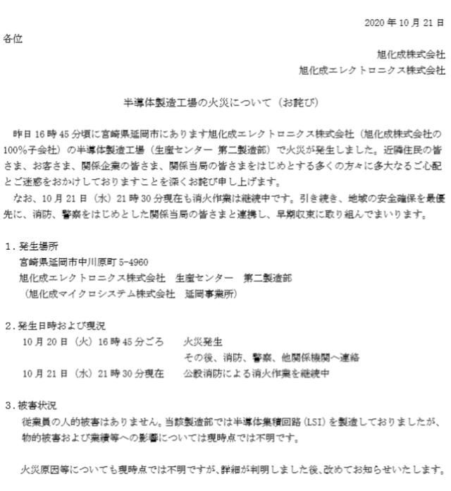10月21日,旭化成对外发布了道歉信,通报了火灾情况,并在公告指出,旗下子公司负责制造LSI的工厂因火灾停产。