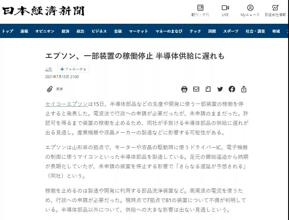 爱普生还表示,在未提出申请的据点中,酒田事业所生产的部分半导体原先就因供需紧绷导致交期延长,而受此次部分设备停工影响,预估将让交期进一步推延。