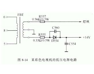 熔断电阻器大多用于电路的限流,因此可以说熔断电阻器的主要功能还是保险作用。熔断电阻器被广泛应用在彩色电视机、录像机等家用电器的电路中。图8-14 为某彩色电视机的低压电惊电路,其中用到两个熔断电阻器。R555 熔断电阻串接在+14V 供电回路中,当电视机的扫描电路及伴音电路等电路出现大电流故障时, R555 将被熔断,对+14V 供电的电路起到保护作用。R557 熔断电阻串接在显像管灯丝回路中,当电源出现破坏性故障或行扫描逆程电容器容量减小使灯丝回路出现大电流时, R557 便会很快熔断,可避免发生烧毁灯丝的恶性事故。