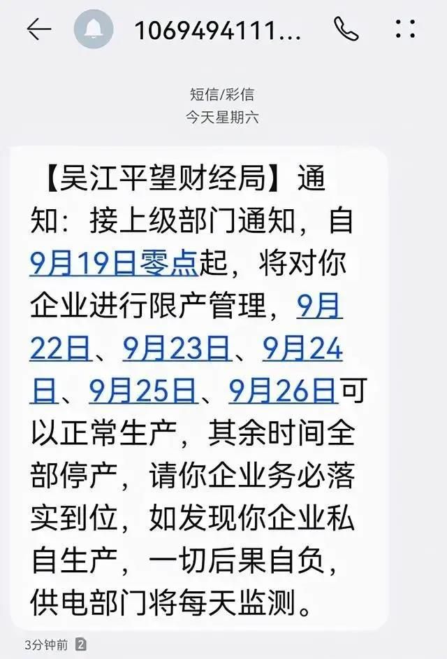 各地要在确保安全的前提下高耗能重点用能企业停产至月底。9月21日11时前未关停的高耗能重点用能企业,将由电力部门采取措施。共涉及我区161家企业,全部印染、化纤行业企业。请各镇(街)通知企业按要求执行,马鞍街道要通过热电企业立即降低供热负荷,以供热负荷降低情况有序安排用热企业梯次停产。”
