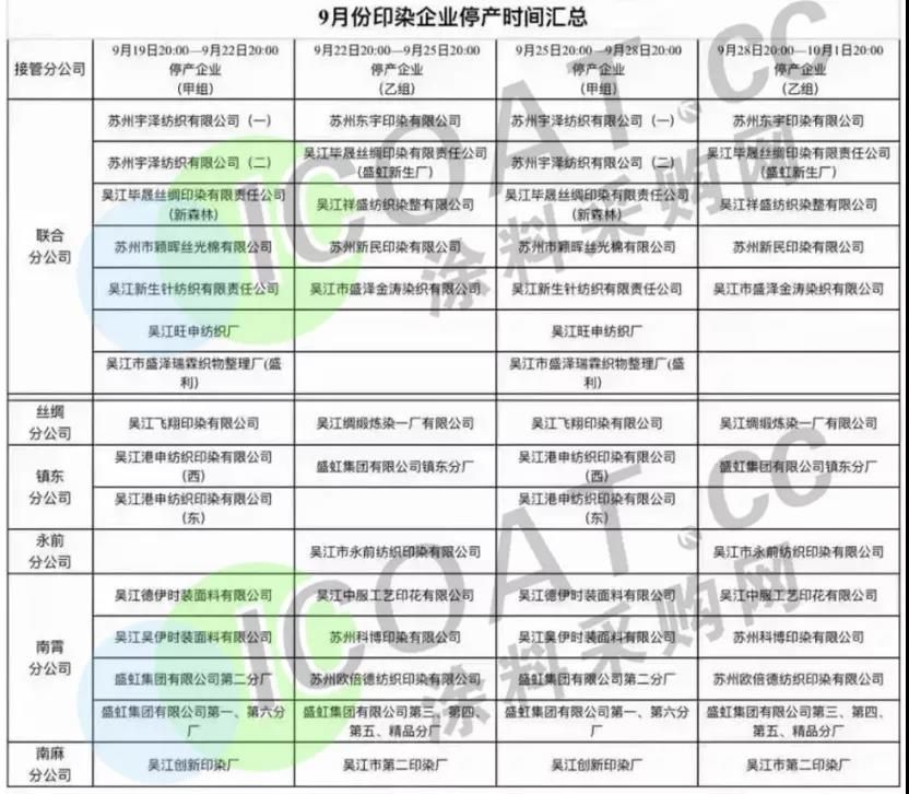 苏州吴江地区某企业透露,9月份当地印染企业被安排停产,时间从9月19日至10月1日,分为四组,涉及企业数十家。