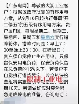 部分地区通知,轮休要停止生产用电,保留生活、宿舍、饭堂、照明、保安、保温、应急等用电(不高于容量的20%)。对不自觉参与全面错峰的客户,将按规定采取强制停电并追加停电48小时。