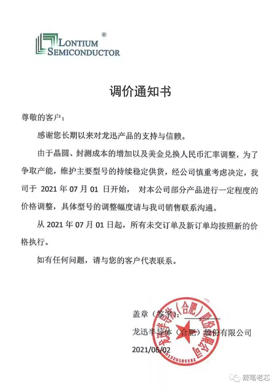 龙迅半导体6月2日发布通知函表示,由于晶圆、封测成本的增加以及美金兑换人民币汇率调整,对部分产品进行一定程度的价格调整,从2021年07月01日起,所有未交订单及新订单均按照新的价格执行。